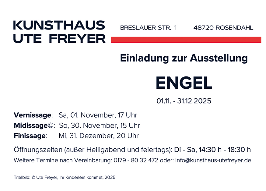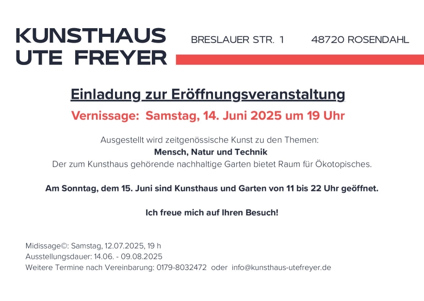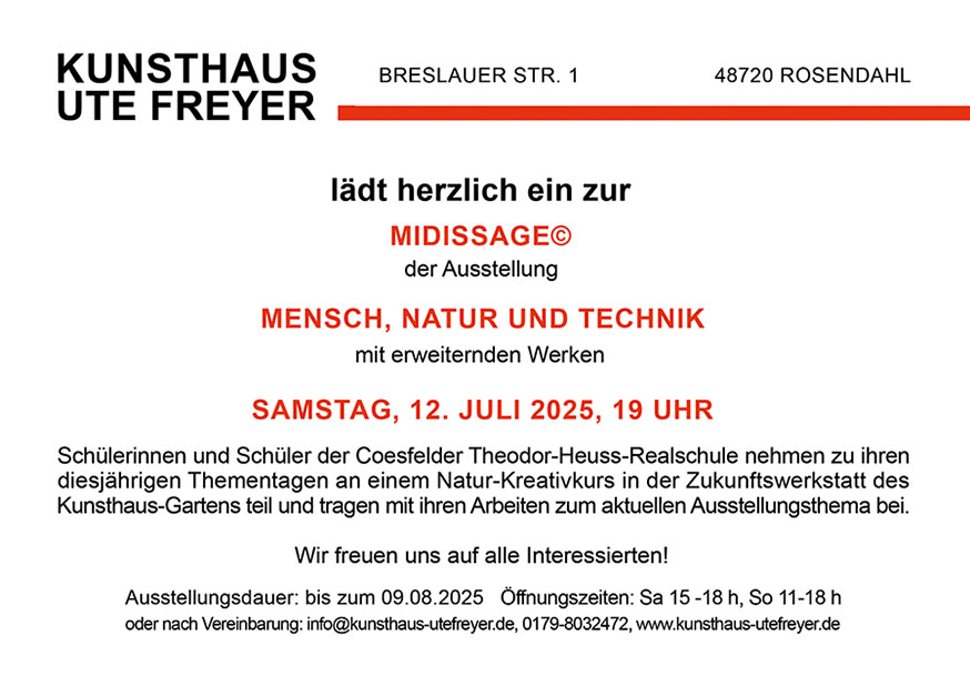 |   | KUNSTHAUS UTE FREYER zeigt Arbeiten von 25 Künstler:innen, die die Themen "Mensch, Natur und Technik" - ob kombiniert oder getrennt, traditionell oder innovativ - mit individuellem offenen Blick angehen und durch ihre eigenen Handschriften, ihrem künstlerischen Können, ihres kreativen und einfallsreichen Um-die-Ecke-Denkens, aber ebenso durch ihr soziales Verhalten überzeugen. Die Seele des Künstlers steckt im Kunstwerk und bestimmt dessen Aura! Die zeitliche Spannweite der Entstehung der Bilder geht bis in das letzte Jahrzehnt des 20. Jahrhunderts zurück. Somit sind auch Werke vieler älterer und bereits verstorbener Kunstschaffender in dieser Ausstellung zu sehen. Ihre Arbeiten sind zeitlos bzw. haben nichts an Aktualität verloren - viele erhalten, zum Teil in stärkerem Maße, erst heute ihre zeitbezogene Relevanz. Als Genre gehört die Landschaftsmalerei - im Sinne einer Neo-Romantik - genauso zum Ausstellungsthema wie Science-Fiction-Bilder und Technik-Objekte. Mit den Bildern dieser Ausstellung wird die Auseinandersetzung mit Themen angeregt, die mit unserem Naturempfinden, unserem Konsumverhalten, den Umweltproblemen und Klimakatastrophen sowie der Ressourcenausbeutung und (Über)technisierung unserer Gesellschaft zu tun haben. Alternative kreative Bildungsangebote und Gesprächsrunden, die zukunftsweisende Ideen diskutieren, begleiten diese Ausstellung. |